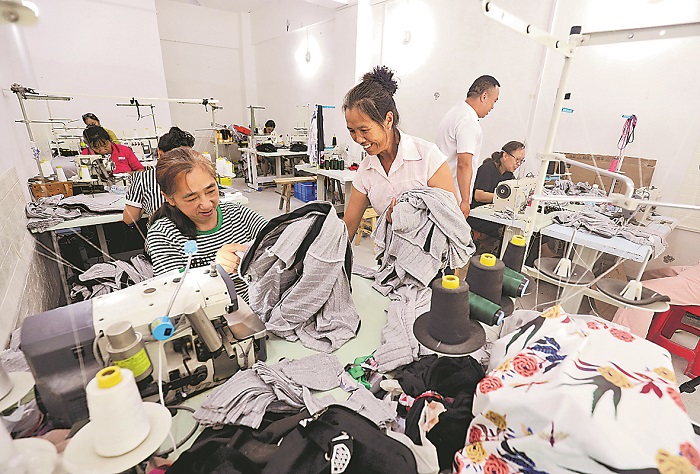 近日,在湖南省资兴市州门司镇一家就业帮扶车间,工人在生产车间赶制服饰产品。眼下,湖南省资兴市多措并举扎实推进灾后恢复重建工作,当地相关部门和乡镇发挥包联帮扶作用,帮扶指导因前期洪灾停产的企业加快修复基础设施,尽快复工复产,全力帮助企业稳客户、稳订单、拓市场,助力人民群众就业增收。本报通讯员 李科 摄