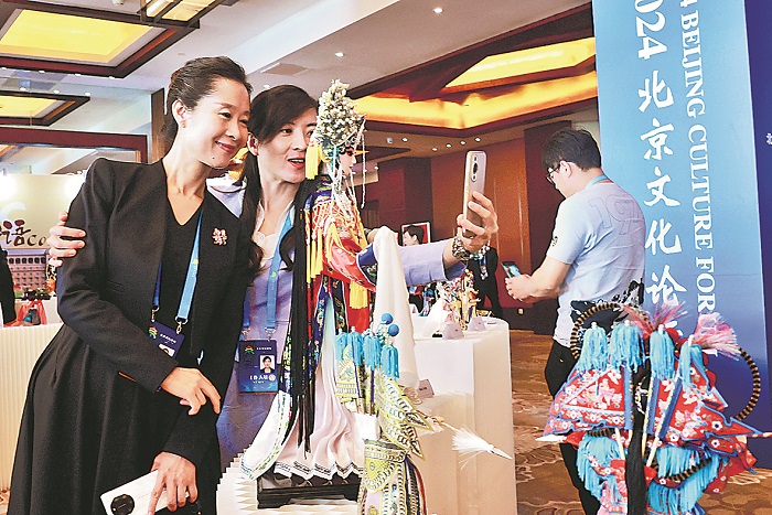 工作人员在论坛上与非遗北京绢人合影留念。本报记者 蔚可任 摄