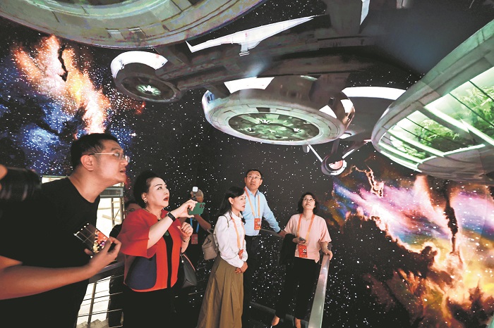 北京文化论坛线路三的嘉宾在利亚德集团“科技体验中心”感受元宇宙体验舱。本报记者 蔚可任 摄