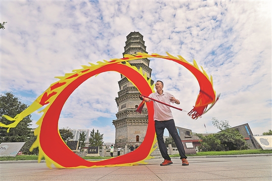 9月21日,市民在山东省滕州市龙泉广场舞龙健身。