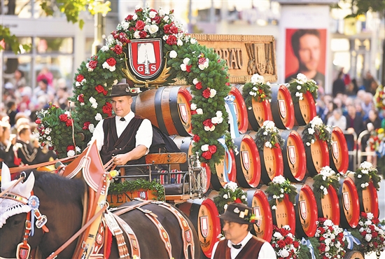 当地时间9月21日,第189届慕尼黑啤酒节开幕。慕尼黑啤酒节始于1810年,已成为德国最著名的民俗节庆活动之一。这是当日拍摄的德国慕尼黑啤酒节开幕大游行现场。新华社记者 任鹏飞 摄