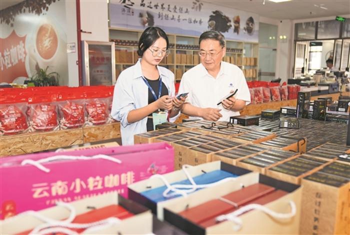 9月23日,游客在保山市隆阳区咖啡直播基地购买咖啡。