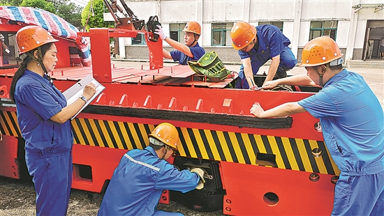 近年来,安徽安庆铜矿着力打造绿色矿山,并通过科技进步、设备更新、环境改善等为职工创造安全环保的工作环境。图为这个矿机运工区对新引进的3台用于井下矿产品运输的新型斩波调速电机车进行使用前的检测维护,该电机车具有高效安全、节能环保等优点。杨勤华 摄