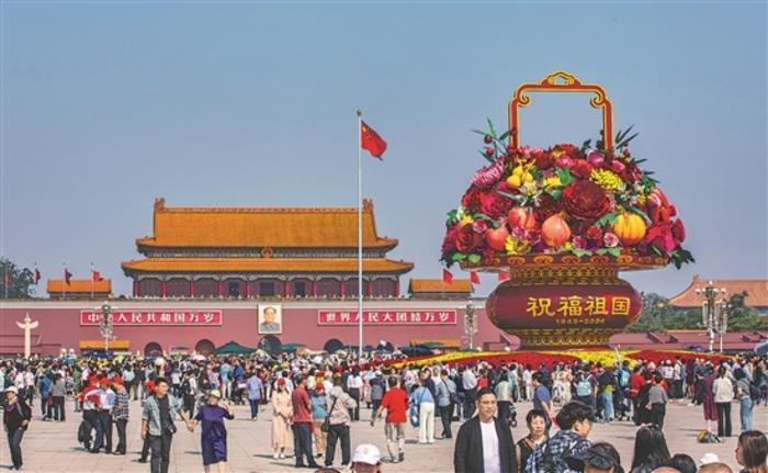 当日,“祝福祖国”巨型花篮亮相北京天安门广场。“祝福祖国”巨型花篮顶高18米,以喜庆的蔬果花篮为主景,篮内除传统的牡丹花、月季花等花卉外,首次选取了分别寓意福禄吉祥、喜庆丰收、红红火火的葫芦、南瓜、辣椒等蔬果,体现“蔬果飘香、繁花似锦”。