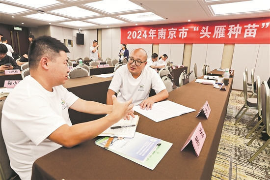 9月25日,在南京农业大学“头雁种苗”培育助飞项目培训班上,徐磊(图右)和种植大户的周诚讨论葡萄保鲜的方法。