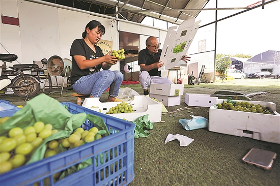 江苏省南京市栖霞区八卦洲坝上鲜果园,徐磊(图右)和妻子一起打包葡萄准备发货。