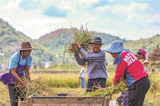9月21日,贵州省黔西市钟山镇铜鼓村,农民趁晴好天气抢收水稻,确保粮食颗粒归仓。本报通讯员 范晖 摄