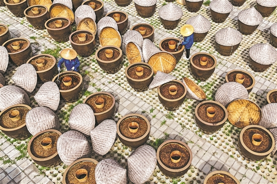 9月21日,山东省滕州市一家酱醋食品企业,工人利用晴好天气浇淋晒制酱油,让大缸里的酱料充分发酵。本报通讯员 张进刚 摄
