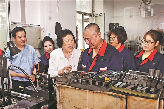 7月12日,辽宁沈阳,尉凤英(左三)走进沈阳君威新能科技有限公司,在车间与一线车床工人交流。