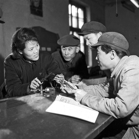 1964年3月,辽宁沈阳,尉凤英(左一)和技术革新红专大队的工人一起在研究有色金属冷挤压加工的技术革新项目。工人日报 蔡壮田 摄