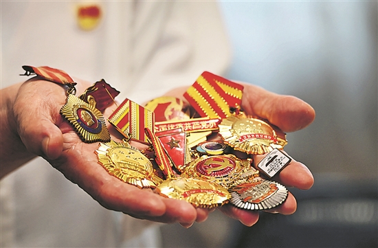 7月12日,辽宁沈阳,尉凤英在家中捧着奖章讲述过去的故事。