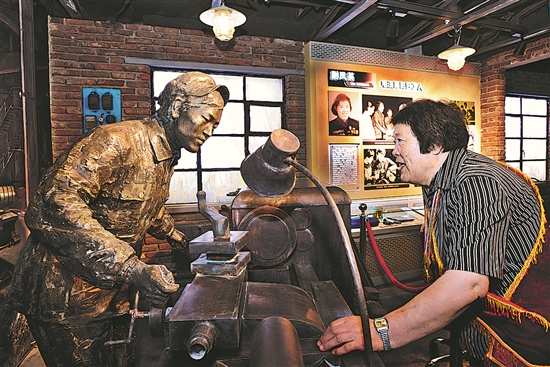 2016年6月16日,辽宁沈阳,沈阳劳动模范纪念馆开馆,尉凤英在自己的雕像前忆当年。