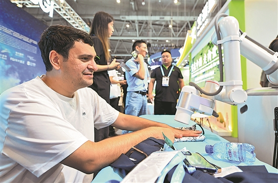 日前,在浙江杭州,外国观众体验机器人艾灸。当日,在第三届全球数字贸易博览会现场,展出的中医机器人吸引观众体验。王刚 摄/中新社