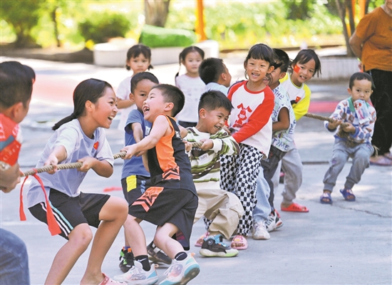 刚刚过去的国庆假期中,广西柳州市柳江区乡村的孩子们用荡秋千、拔河、打陀螺、跳绳等方式娱乐健身,享受快乐假期,强健体魄。图为柳州市柳江区三都镇白见村板朝屯的小朋友们在进行拔河比赛。