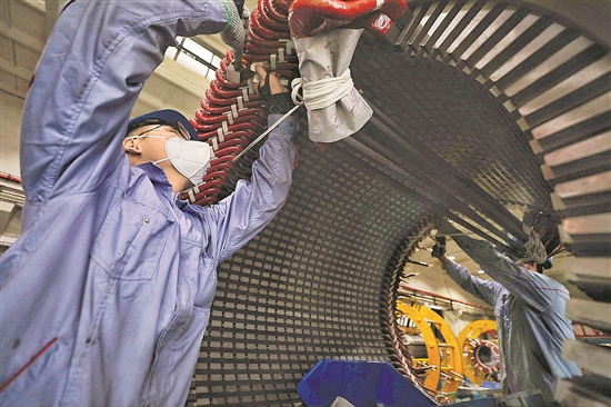 10月10日,黑龙江省佳木斯市,在哈尔滨电气集团佳木斯电机股份有限公司电机装配车间,工人正在忙碌工作。