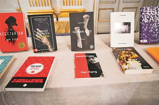 当地时间10月10日,瑞典斯德哥尔摩,在瑞典文学院,韩国作家韩江被宣布为2024年诺贝尔文学奖得主。她的作品直面历史创伤,揭露人类生命的脆弱性。瑞典文学院表示,她“因其直面历史创伤、揭露人类生命脆弱性的强烈诗意散文”而获奖。图为韩江的作品正在展出。视觉中国 供图