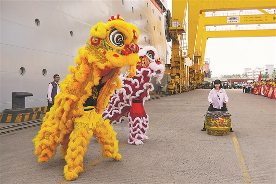 当地时间10月12日,人们在孟加拉国吉大港表演舞狮欢迎中国海军戚继光舰、井冈山舰到访孟加拉国。