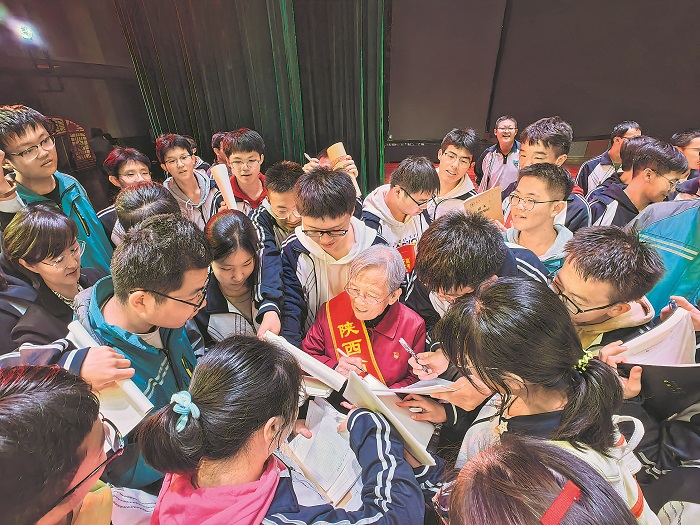 10月12日,陕西省榆林市总工会、市教育局联合开展“劳模工匠进校园”活动。在榆林市第一中学,“人民医护工作者”国家荣誉称号获得者、全国道德模范路生梅为广大师生宣讲。宣讲结束后,广大师生们拿着书本围着路生梅,等待她的签名和赠语。本报记者 祝盼 本报通讯员 李锦涛 摄