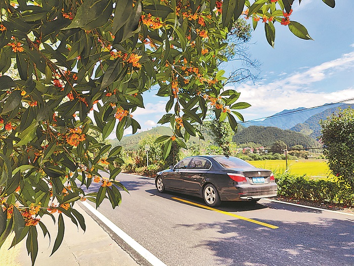 10月13日,在浙江开化县华殿线郑家路段,公路旁的桂花香气扑鼻。近年来,该县公路港航与运输管理中心在公路绿化美化过程中,根据不同路段的特点,有针对性地种植不同树种,打造春夏秋冬各不同的季节景观。徐曙光 邹平枫 摄
