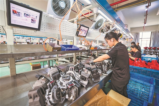 日前,在位于金华市的浙江托马斯工具制造有限公司数字化车间内,工人在流水线上生产出口的园林机械。