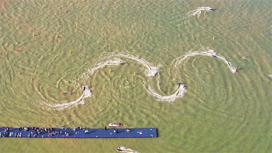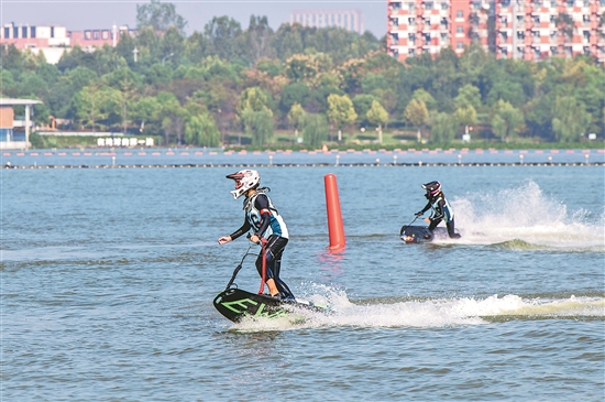 10月14日,运动员在湖面上角逐。新华社发(胡肖飞 摄)