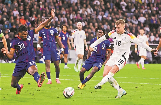 当地时间10月14日,在欧足联欧洲国家联赛A级联赛中,德国队主场1比0战胜荷兰队。图为荷兰队球员邓弗里斯(左一)试图封堵德国队球员米特尔施泰特(右一)的射门。新华社发(菲利普·鲁伊兹 摄)