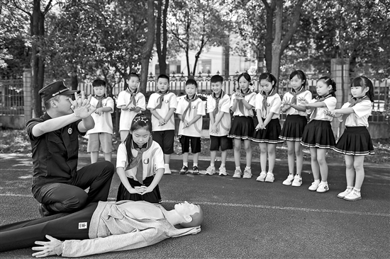 近日,在江苏省兴化市陈堡中心小学,兴化市消防救援大队消防员对学生进行心肺复苏急救培训。