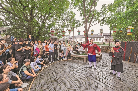 10月17日,游客在乌镇街头观看古镇嘉年华的演出剧目。