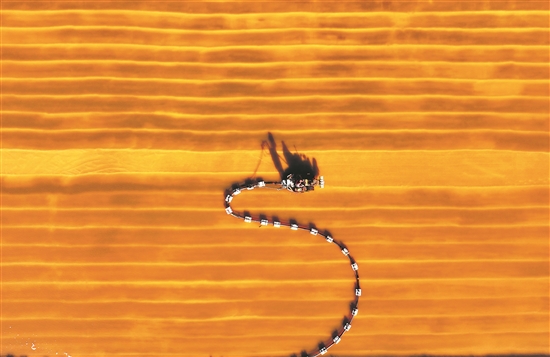 时下正值秋盐收获季,河北省唐山市曹妃甸区南堡盐场的工人利用晴好天气抢收秋盐,“百里盐池”呈现出一片繁忙景象。