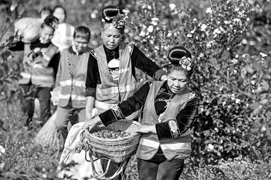 10月15日,贵州省黔南布依族苗族自治州龙里县颐光山林油茶生态园迎来收获季,村民忙着采收、搬运、晾晒。近年来,该生态园流转3000余亩荒山发展生态油茶种植,吸纳当地村民务工,助村民致富增收,促进乡村振兴。新华社记者 杨文斌 摄