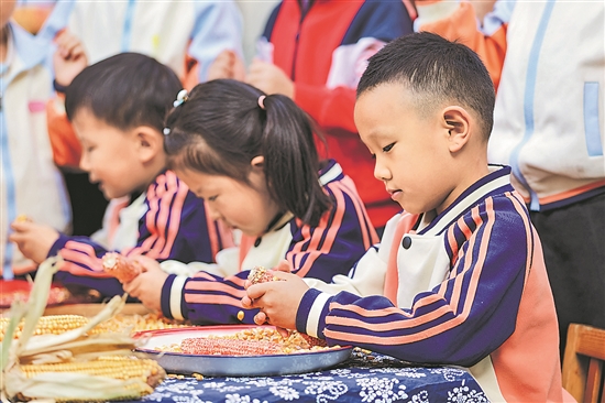 10月16日,在山东省青岛市李沧区青峰路幼儿园,小朋友参加搓玉米比赛。当日是世界粮食日,各地开展主题教育活动,增强孩子们爱惜粮食、节约粮食的意识。新华社发(张鹰 摄)