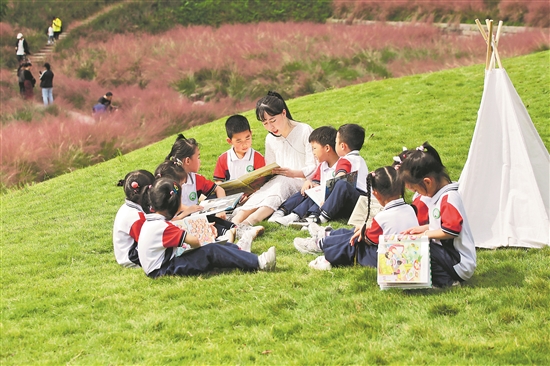 正逢粉黛乱子草盛开的时节,图为孩子们在优美的自然环境中,和老师一起读书。