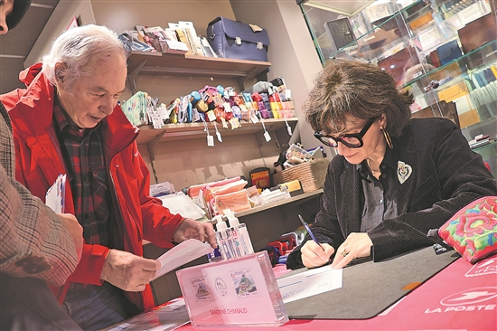 近日,在法国巴黎举行的《中法建交六十周年》纪念邮票首发仪式现场,邮票设计者之一、法国艺术家桑德里娜·尚博为集邮爱好者签名。新华社记者 张百慧 摄