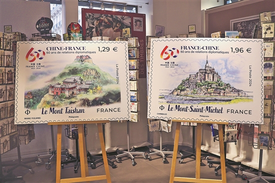 这是近日在法国巴黎举行的《中法建交六十周年》纪念邮票首发仪式现场拍摄的邮票图案展示。新华社记者 张百慧 摄