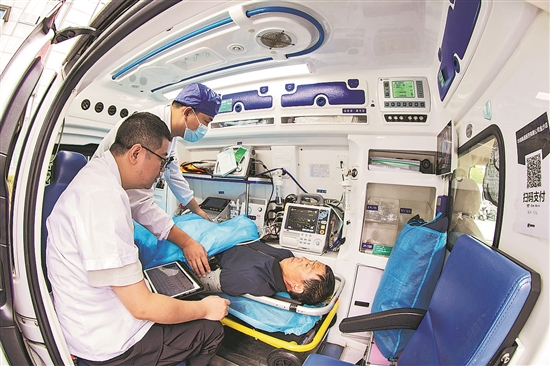 该院利用5G+物联网技术,采集现运行救护车危重病人心电图、生命体征、救治图像与医院急诊系统五大中心对接,做到“上车即入院”。翟慧勇 摄/视觉中国