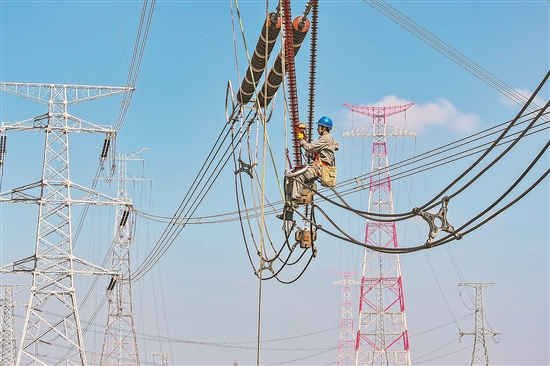 10月23日,在江苏泰州凤城至无锡梅里500千伏输变电工程年度检修现场,江苏省送变电有限公司检修人员正在对跳线悬垂合成绝缘子串进行更换,保障电网安全稳定运行。据悉,该工程是我国规模最大的超高压跨越长江输变电工程,自投运以来,已累计送电超175亿千瓦时。本报记者 王伟 本报通讯员 史俊 摄