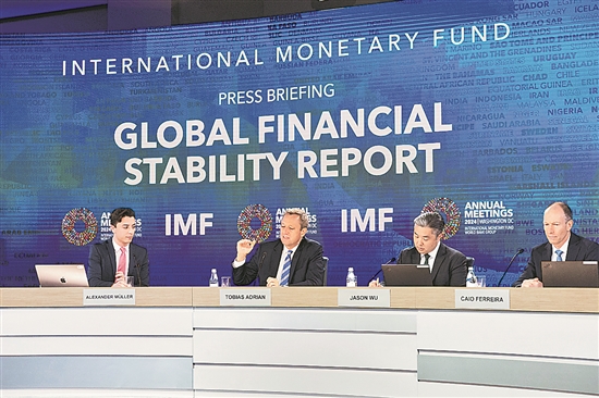 图为国际货币基金组织(IMF)在美国华盛顿举行《全球金融稳定报告》媒体发布会。