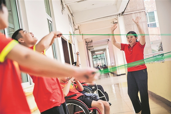 近日,广西壮族自治区玉林市特殊教育学校,康复老师正带领残障学员进行拉伸训练。