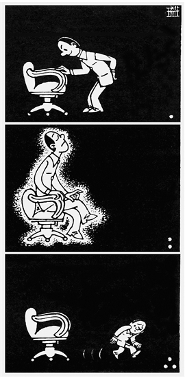 再后来,刘局的胆子也变大了,他做了一些当初“大刘”想都不敢想的事情。可以想象的是,刘局离开了那把提升自己胆量的座椅。就在刘局屁股离开座位那一瞬间,他的身段以迅雷不及掩耳之势降了下来,这又是谁?伟岸高大的刘局,被低矮到几近令人忽视的“老刘”取代。现在再看刘某,身姿竟然连当年的大刘都不及了。此刻的心情,心理脆弱一些的旁观者都不忍心描述。