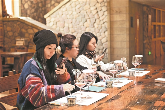 10月23日,游客在位于宁夏回族自治区银川市的志辉源石酒庄品酒。深秋时节,位于宁夏贺兰山东麓的多家酒庄彩叶缤纷、秋色宜人,吸引不少游客前来参观品酒。