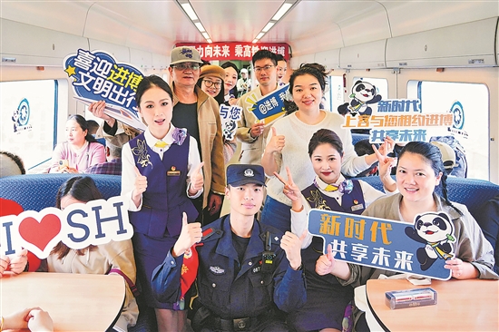 10月28日,在D3205次列车上,旅客与上海客运段乘务人员为进博会送上祝福。第七届中国国际进口博览会开幕在即,当日,铁路上海客运段在D3205次列车上开展“心聚力向未来 乘高铁迎进博”主题活动,向旅客介绍进博会亮点,为进博会送上祝福。
