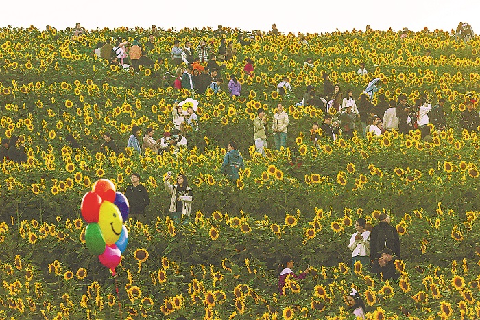 10月27日,游客在北京市朝阳区温榆河公园的“芸上梯田”向日葵花海拍照打卡。