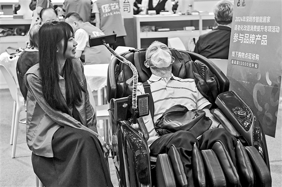 10月27日,老人在博览会上体验按摩椅。