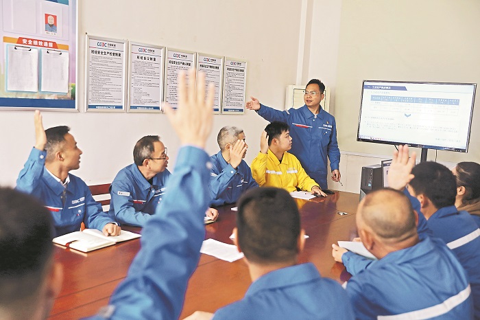 中国能建易普力公司定期组织班组讨论会,让一线职工在进行各类技能培训和业务学习的同时,也积极提出合理化建议,共同解决生产过程中的问题。图为10月22日,该公司的一家工厂内,职工正在召开班组讨论会。本报记者 王伟伟 摄
