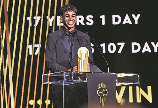 当日,摘得象征最佳年轻球员“科帕奖”的西班牙球员亚马尔在颁奖典礼上。新华社记者 高静 摄