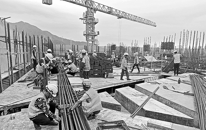 图为工人们正在绑扎屋面层钢筋,为主体封顶做最后冲刺。本报通讯员 时冉冉 余洋 摄