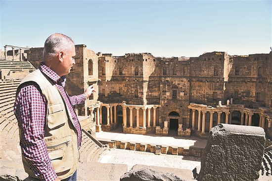 作为历史上的战略要地以及沙漠商队和信徒朝觐的重要中转站,叙利亚的布斯拉古城被镌刻上不同文明的印记,是叙利亚的文化瑰宝,1980年被列入《世界遗产名录》。然而,经历13年的叙利亚内战,布斯拉古城的一些历史遗迹被炸毁,部分文物被盗。游客对周边安全形势的担忧严重影响了当地旅游业的发展。这导致小镇居民失去了重要的收入来源,文物工作者大量流失。图为近日,在叙利亚德拉省布斯拉镇,布斯拉古城遗址管理部门负责人阿拉·萨拉赫介绍情况。
