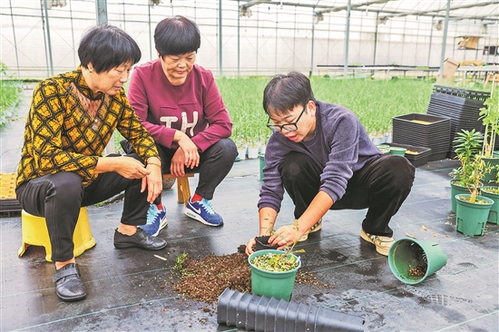 10月31日,在银湖街道唐家坞村禾美农旅融合式的共富工坊内,95后农创客汪雷(右一)指导村民进行盆栽移苗。该共富工坊拥有近3000平方米高标准苗圃,主要培育国外进口的观赏性植物盆栽,帮助10余名村民实现“家门口”就业。