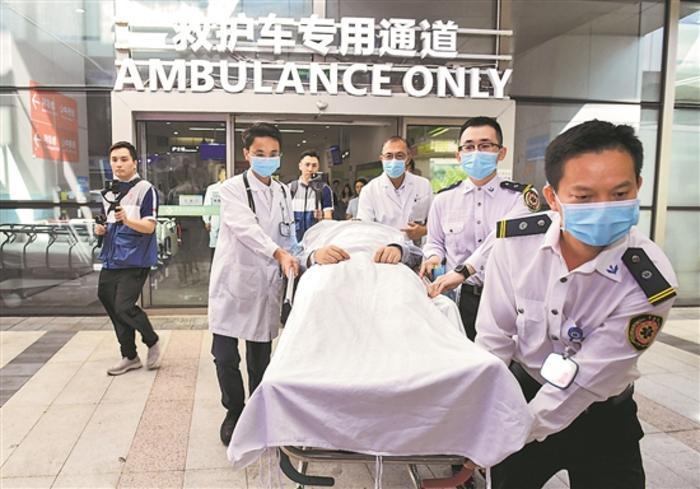 10月31日,在香港大学深圳医院,医护和急救人员在运送“患者”。当日,第二次粤港跨境直通救护车演练在深圳和香港举行。据悉,粤港跨境直通救护车试行计划11月正式推行。新华社记者 毛思倩 摄