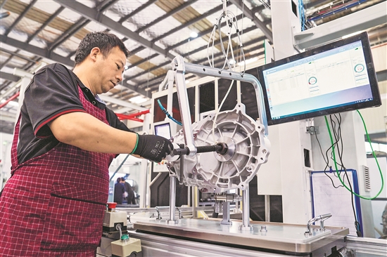 在位于江苏省南通市如东经济开发区的江苏御传新能源科技有限公司,工人在生产车间内装配新能源汽车传动系统零件(11月2日摄)。